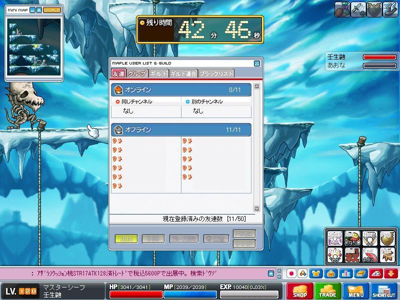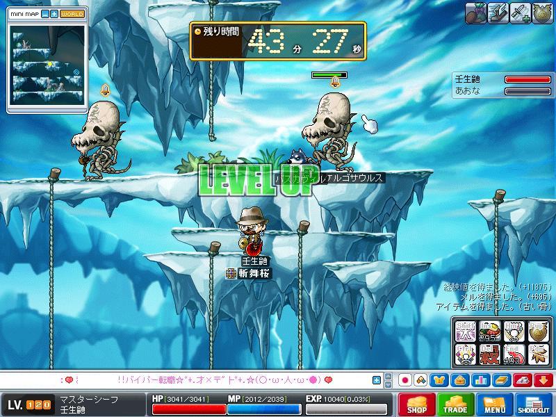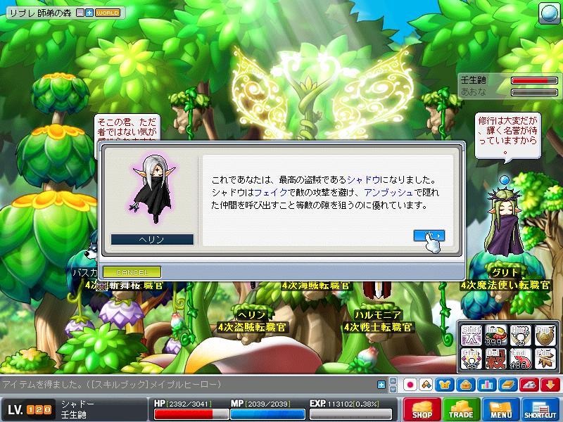 私は壬生鼬のレベルについて明言するのを避けてきました。 「ワレどんだけ育成してないねん!いつまでも同じレベルやないか!」と言われるのを避けるためです。 現時点での主要キャラのレベルを書いておきます。 鴉 85 獅子50 鳩 80 あら72 鼬は8月16日に最後にレベルを書いた時点で(うろ覚え)101。 3ヶ月以上書いてなかった(笑 そして今日。 区切りがついたので書きます。 120到達 しました。 そしてそのときの友録の様子。 誰もいなくて報告できねぇwwwwww でもまぁそこから グリフォンとドラゴンはいなかったので金に物を言わせて 必要アイテムを揃え ついに斬り賊4次職「シャドー」に転職いたしました。 レベル上げもひと段落して、明日からはマスタリー購入のための黒字狩りをしていきたいと思います。 |