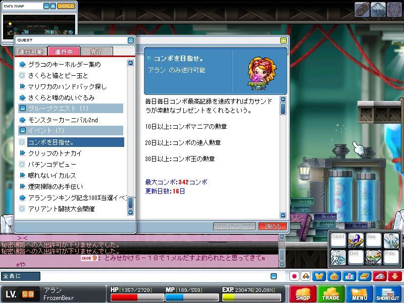 意味はなし。 コンボ日数が消失してしまい、失意のうちにのろのろとマガティアに向かい、自暴自棄になり格上のホムン&サイティを狩っていたFrozenBear 何気なくクエスト欄を開いて再確認。 あぁ、どうせ変わってないよな。 15日分貯めたのは無駄だったのかなぁ……。 とか。思ってたり。 してたのですよ。 ん。 ん? んん? ん、ん、ん、ん? Oh... 復活してるッ!! コンボ日数、復活ッ!コンボ日数復活ッ!コンボ日数、復活ッ! 何故かわかりませんが、諦めてもコンボ数更新すれば日数も諦める前の分も加味されるようです。 いやぁよかったよかった。 あと5日でコンボマスター、15日後にはコンボ王の勲章を入手できますよ。 |
