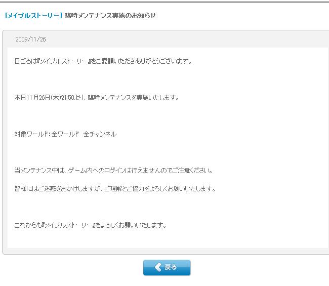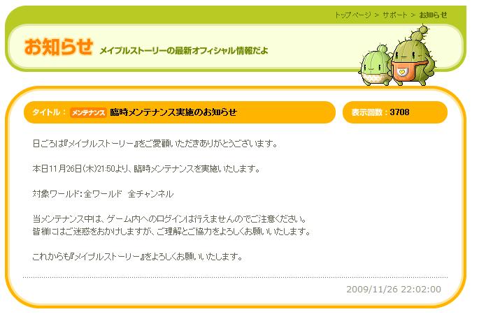 途端にメンテのお知らせ!? 友チャでぐちぐち言ってたら紅さんから一言。 「鼬s24時間後ですよw」 なんだ明日かよw びっくりさせやがってー。 ネクソンのおちゃーめさん♪ ん?でもなんで24時間後のメンテを今告知するn…… ……お、落ちたじゃん! やっぱり今日のようでした。 どうやらポイントアイテムに絡む重大なバグがあったようで。 その修正みたいですね。 2ちゃんによると Pアイテムを露店に出せる ↓ 何故か手元に残る ↓ Pアイテム増殖可能 ってことみたいです。 ……そりゃ修正するわいな。 |