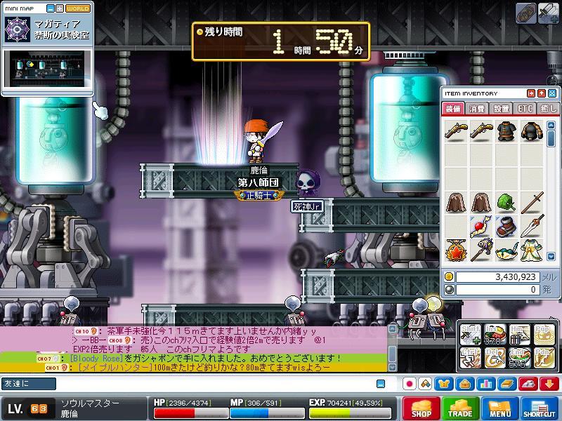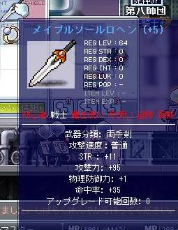 場所は混雑がなくトラブルもない……しかし人との出会いもない孤独が支配するロイドのミニダンジョン。 何言ってんだ俺は。 ……開始10分のアイテム欄です。 出すぎだろ! 1匹目でバニングヘールが出てその後3分もしないうちに2個目が出ました。 2時間ほど狩った後の最終結果はこちらに。 結局バニングヘールは3つ出て750kも懐に入りました。 ドロップメルと他の装備も合わせたら1mは超えたかな? さて、鹿倫がレベルアップして64になったのでメイプルソールロヘンを装備。 ですがこのソールロヘン、攻撃82という粗悪品でとてもじゃあないが現在装備中のグリースには届きません。 攻撃+13を一回の強化で成し遂げるのは無理だと判断し、30%を2枚貼って消えていただくことにしました。 ……ま、貼り付けばラッキーだしね。 ……で、その結果がですね……成功……しちゃったんですよ。1枚。 30○ 30△ ですよ。 この時点でATK87。 4枚貼り付けばグリースと攻撃力は同等……! しかもSTR6分のボーナスと35もの命中補正が手に入る……! しかしここまでのトータルの壬生のツキは最悪……! 一枚目ッ!……成功! 二枚目ッ!……成功! あぁもうめんどくせぇや。カイジ読んだからって影響されてんじゃねーよ俺! 三枚目成功、4枚目失敗、五枚目成功で結局能力はATK95、STR11、命中35になりました。 実際ホントに捨てるつもりで貼ったのになぁ……。 前に消しちゃった86?のに同じ強化が成功してたら99ですよ。 気合いれちゃだめなんだよね。 でも期待しちゃうもん。だって人間だもの。 ……何書いてんのか自分でもよくわかりません。 結果だけ貼って寝ます。 青文字まではいくんだけどねぇ…… その先が難しい。 |