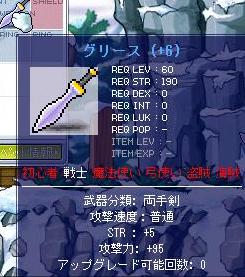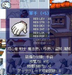 それでシグナスに向けて低レベルで使いまわせるようにと軍手を作ったのね。 それに持ってた30%攻撃の書を捨てるつもりで貼り付けたのね。 1発成功なのね。 それで20m近く使って60%攻撃の書を3枚買ったのね。 全部成功して9になったのね。 そして最後に100%攻撃の書を3.5mで買ったのね。 ……攻撃10軍手できちゃったよ。 気合入れて強化したら大損するんだけど何も考えずに捨てるつもりで貼ったら成功するんだなぁ…… つってもまぁ全財産なくなっちゃったんだけど(笑 あぁ眠い……。 あと少しあと少しといい続けてこんな時間だ。 もう寝よう……。 ATK10軍手様の雄姿。 今日の強化成績 30% ○2△2×1 60% ○8△1 100%○2(当たり前か 標準+15のLv60両手剣グリース作成 攻撃+10の軍手作成 標準+3Mソールロヘンロスト ……ま、ラッキーかな。 PR |