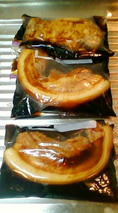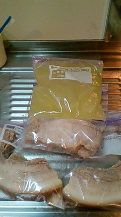 材料はこちら ○豚と煮込み具材○ 豚バラ肉、豚ロース肉 300g~ 葱の青いところ(白いところは別の料理に使いましょう) 2本分~ にんにく 1片~ しょうが 1片~ ○タレ○ 醤油 適宜 味醂 適宜 酒 適宜 ○下ごしらえ○ にんにく、しょうがは皮をむいて切る。 大きさは適当でOK。 不安なら5mm角くらいに切ってくだしあ。 ○調理○ と言っても簡単です。 ほぼ2ステップ。 豚肉を煮る。 豚肉、にんにく、しょうがを鍋に入れてひたひたになるまで水を入れる。 水を入れる前。 火にかけ、弱火でことこと煮る。 最低でも30分は煮ること。 あくは適宜とりましょう。 豚肉に火が通ったら引き上げる。 手前の2つばバラ肉、その向こうがロース。一番向こうの液体は豚などの茹で汁です。 ラーメンの出汁にでも使いましょう。 漬けダレを作る。 しょうゆ、みりん、酒を1:1:1の割合で鍋に入れ、火にかける。 1度沸騰させて火を止める。 ビニール袋(ジップロックなど、丈夫でチャック機能がついてあるものを推奨)に豚肉と漬けダレを入れて空気を抜き、冷ます。 数時間は漬けておく。 すぐに食べないのであれば冷蔵庫に入れて保存すると良いです。 以前作ったときなかなか美味くできたのでまた豚肉の量を増量して作ってみました。 豚肉の塊はそんなに良い肉でなくても大丈夫です。 今回は4割引~半額のアメリカ産豚肉を使いました。 100gあたり140円そこらです。 500gだと700円ほど。他の材料をあわせても1000円ほどで作れます。 個人的な好みで言わせてもらうと、ある程度脂が多い方が美味しいです。 なのでバラ肉がお勧め。 香味野菜は入れなくてもOK。 でも入れた方が美味いと思いますです。 葱、しょうが、にんにく以外に玉ねぎや人参を入れても良いかも。 あとローリエなんかも良いんじゃないかな? タレの分量は1:1:1 以前作ったときは300~400gの豚バラ肉に対して50mlずつ、150mlほどを使いました。 今回は合計1kgくらいの豚肉だったので、1カップずつ使い、足りなくなったのでお玉1杯ずつ追加しました。 要は漬け込めればいいのでビニール袋を使わずとも良いのですが、タレを節約できる上に洗い物が少なくなるのでジップロック的なビニール袋の使用を推奨します。 豚肉を茹でたときの茹で汁は出汁が出てるので保存すればいい……とどこかで見たような。 タレとあわせるとラーメンのスープに……ならんか? 仕込みは済んだので実食はまた後日。 冷蔵庫で保存する場合、食べるときにレンジなどで温めてから食べるとウマァいですよ。 煮込んで漬け込むだけで簡単なのでちょっと暇なときに仕込んでみてください。 酒の肴にも、主食にも、炒飯などの具にも良いですよん |