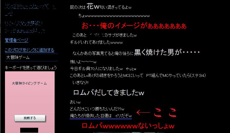 リアルでもメイプル内でも。 ……おいそこ引くな!やらしい意味じゃないから! 「いやー、困ったなぁ」の「いやー」だから!らめぇって意味じゃないから! ……コホン。 あるブログを読んでたんですけどなーんかイライラする。 「まぁ」を多用してたんですよ。 酷かったのは一つの記事の中に7回も使ってるの。 そんで私が間違った使い方ではないと思えたのが1回。 ……私も気をつけます。 中学生で日本語がちょっと怪しい人だったんで仕方ないのかもしれませんが。 古い記事から読んでいってたんですよ。 「モンカニでイリオス提供したらロムバ出された」って書いてた。 提供。……提供? 「自分らがイリオスを召喚した」ってことかしら? 「こちらはイリオス召喚したのにロムバ出された」ってことなのかな? お、俺の理解力が足りないのか!? 私の中ではね、「イリオス召喚を要請したのにロムバ出された」と勝手に理解してたんですよ。 でも読み直してみたら違うっぽい……? 「提案」と間違えてる? それでも変ですよね……。 あぁもうわけわかんない\(^o^)/ 原文 ↓ 俺たちが提供した召還は イリだぞw 名前っぽいところは伏せました。 「←ここ」のところです。 |