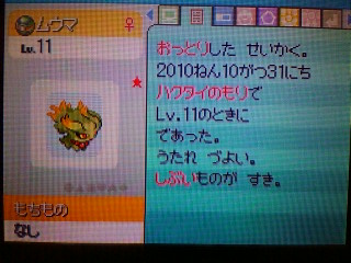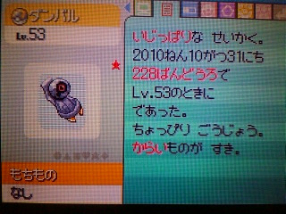 ハロウィンということで、ムウマを狙いました。 ……7連鎖で出現!? もちろん捕獲。 残念ながらその1匹で動揺してしまい、その後は連鎖が続きませんでした。 おっとりした緑色のしぶいものが好きな子。緑茶が似合いそうです。固体値は低め。 その後、本日の大量発生ポケモンは何かと見に行ったらダンバルとのこと。 砂嵐で難易度は高いですが、ムウマを捕獲した勢いで挑戦! ……な、7連鎖で出現!? ですが、勢いあまってきゅうしょにあててしまい倒してしまって落ち込む。 ひとしきり落ち込んだ後、気を取り直して挑戦するも、20連鎖ほどでどうも連鎖失敗してしまう。 それでも諦めずに続けていると、24連鎖ほどで2匹目が出現! 今度は慎重に(45%ほど削った後キノコのほうし→その後はダンバルのとっしんの自滅ダメージのみで削る) いき、なんとかゲットにこぎつけました。 シンクロきいていじっぱりだけれど、残念ながら固体値は極低いものでした。 本日の収穫。 砂嵐とか猛吹雪ではもう2度とやりたくないでござる! |