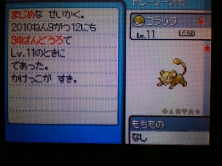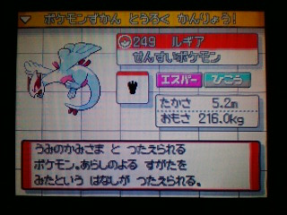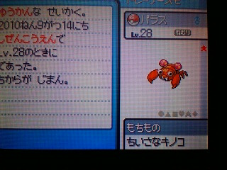 はっぴばーすでーおーれー はっぴばーすでーでぃあみーぶー はっぴばーすでーとぅーみー 誕生日おめでとう!俺! めでたいって年でもないのですがね。 さて、ポケモンBWの発売が3日後となりました。 正直わくわくが止まりません。 なので最近ポケモンSSをずっとプレイしています。 ドーブルやトゲピーを育ててました。 トゲピーをトゲキッスに進化させたので、ひかりのいしがなくなってしまいました。 なので自然公園の虫取り大会に参加して、いしの補充をしてたのですよ。 でもまーなかなか出ない! みずのいし、ほのおのいし、かみなりのいし…… そんなもんはLGから持って来れるんだよ!ひかりかやみかめざめくれよ! と、何度もリセットしては参加しリセットしては参加し…… ようやく出たのがこれです! 色違いパラス!(どーん 自然公園で自然遭遇ですよ。 石なんて頭の中からどっか飛んでっちゃいましたね。 優勝はできなくて石は入手できなかったけれど、色違いパラス捕まえられたからまぁ満足っちゃ満足。 しかし色違いなのかどうかわかりにくいなー(笑 音消してたらわからなかったよ。 それが昨日。 今日は誕生日ということもあって、何か特別なポケモンの色違いがいないか探してみることにしました。 でもただでさえ1/8192の確率ですからね。 なかなかそんなポケモンが出るはず 出ちゃったよ! (あまりの驚きと嬉しさに久しぶりの色つき大文字 もちろん捕獲。 ドーブルのキノコのほうし&みねうちで削ってヘビーボール2個目で入ってくれました。 ホントは体色と同じピンク色のヒールボールかラブラブボールがよかったんだけど、もたついて自滅されちゃたまらんからね。 初めて捕まえたときに出る図鑑登録画面でも色違い。かっけー! 固体値は攻撃と特攻がゴミレベルだったものの、その他のステータスはそこそこだったので良しとします。 しかしわんぱくな海の神ってかわいいなw お金では買えない誕生日プレゼントでしたとさ。 PR |